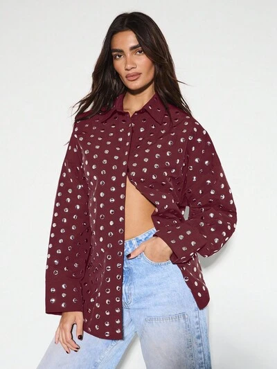 KIZN Sequin Embellished Brown Oversized Button ShirtNEW