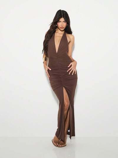 KIZN Plunge Halter Neck Ruched Backless Fitted Floor Length Maxi Dress-50%