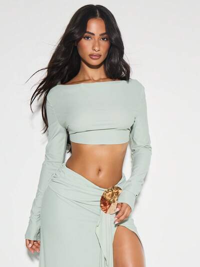 KIZN Backless Boat Neck Crop Top With Tie DetailNEW