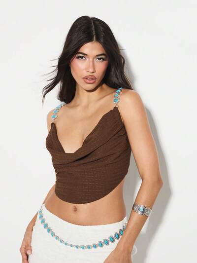 KIZN Textured Cowl Neck Draped Front Crop Tank Jewel Detail-30%