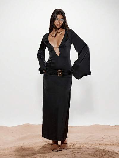KIZN Satin Plunge Neckline Maxi Dress With Bell Sleeve And Belt-40%