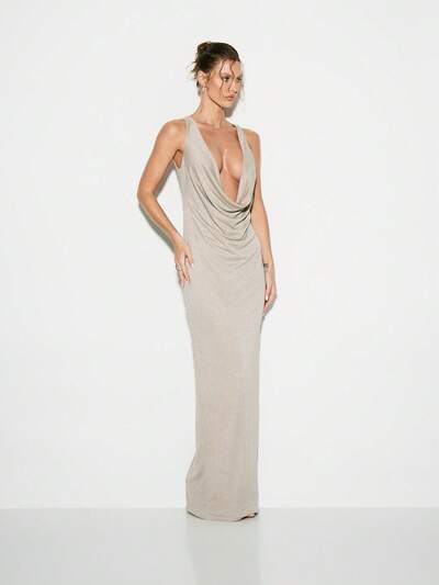 KIZN Vestido largo metalizado con escote pronunciado y espalda descubierta-40%