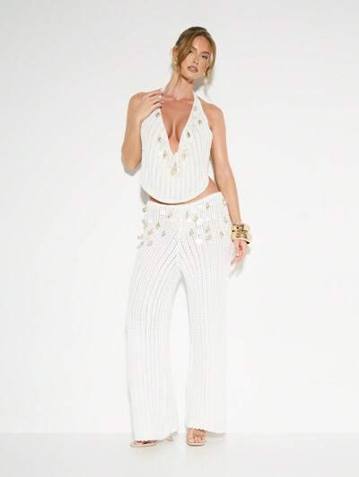 KIZN Pantalones de suéter con diseño palazzo de pierna ancha y crochet-30%