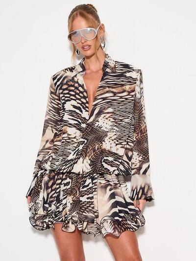 KIZN Mini-robe à imprimé abstrait avec ourlet et col à volantsKIZN Robe blazer à manches bouffantes et col en V