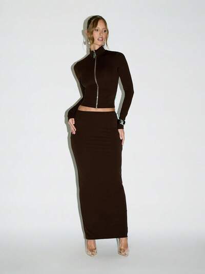 KIZN Completo corto con collo alto e zip e gonna lungaKIZN Top senza schienale con scollo all'americana e motivo paisley in strass