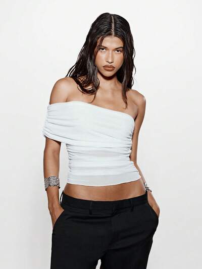 KIZN ルーシュメッシュレイヤードスリムフィットクロップトップ-50%